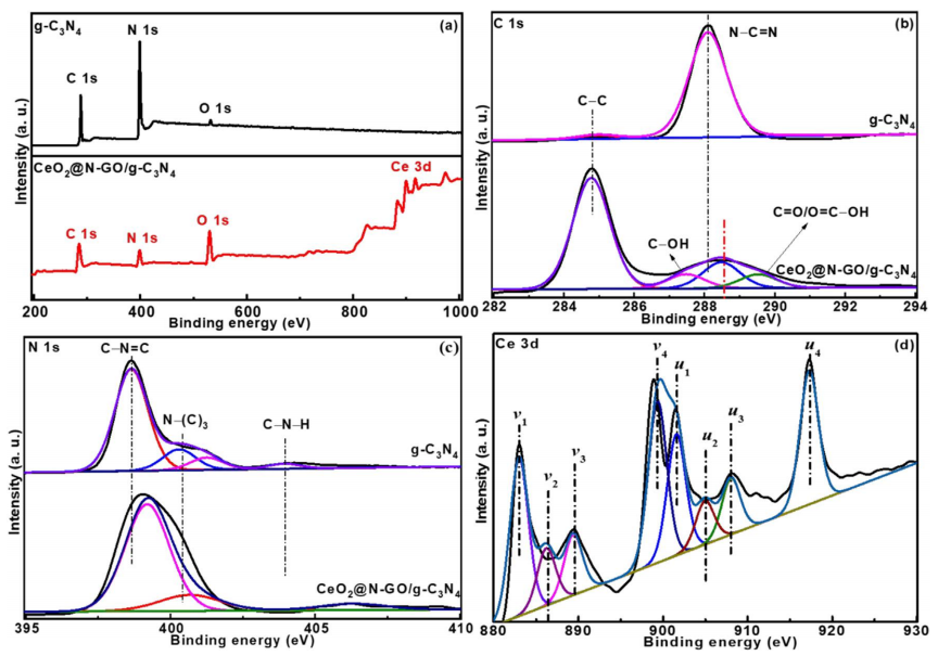 圖2.g-C3N4和CeO2@N-GO/g-C3N4的XPS全譜(a)以及高分辨率的C 1s (b)、N 1s (c)和Ce 3d (d)譜。