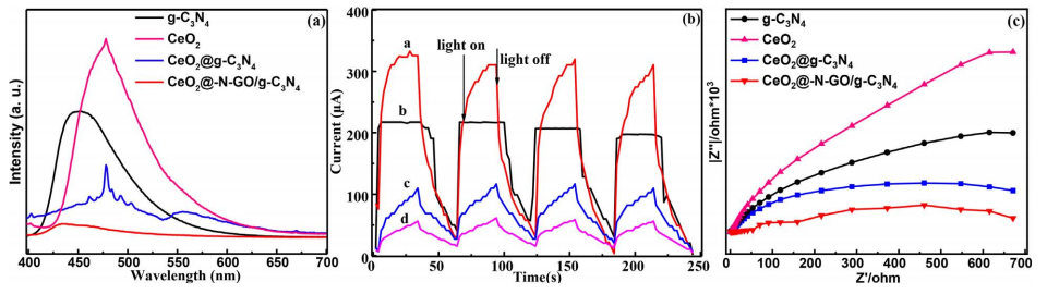 圖4。樣品的PL光譜(a)、瞬態光電流響應(b)和EIS光譜(c)。
