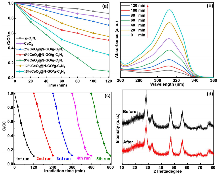 圖5。MBT在g-C3N4、CeO2和具有不同CeO2含量的CeO2@N-GO/g-C3N4上的降解(a)。MBT在不同反應時間的紫外-可見光譜(b),循環實驗(c),以及五次反應循環前后的XRD圖譜(d)的CeO2@N-GO/g-C3N4。