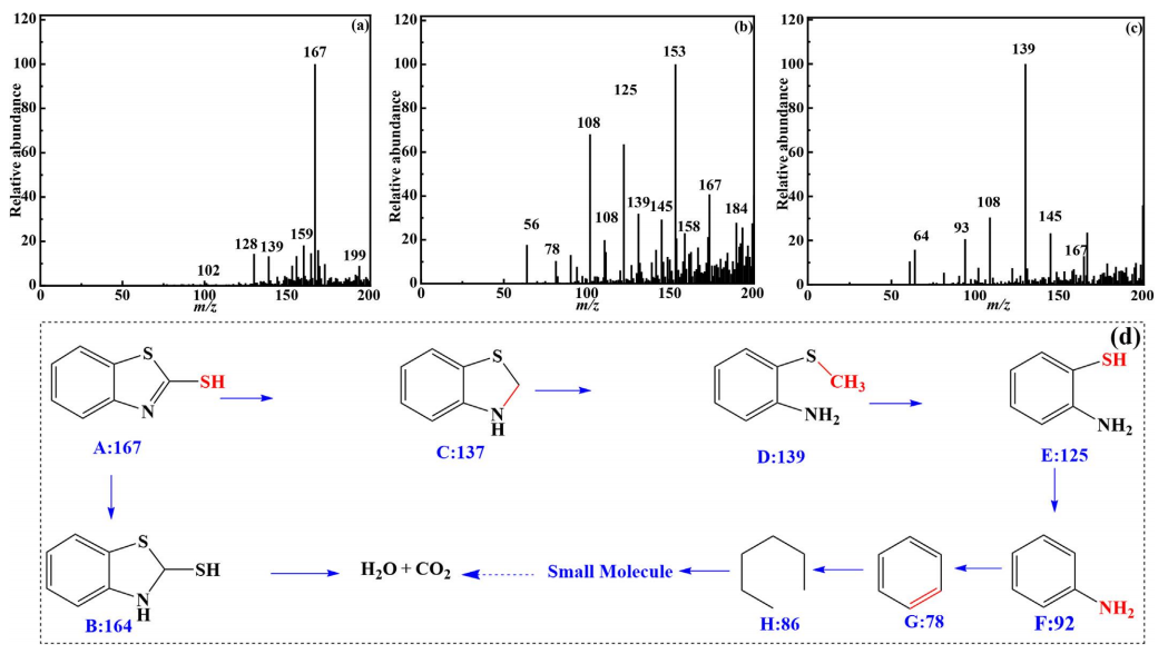 圖6。MBT降解的m/z:初始溶液(a),60分鐘(b)和120分鐘(c)。在CeO2@N-GC g-C3N4上降解MBT過程中產生的不同種類的中間產物(d)。
