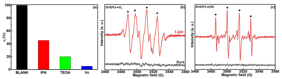 圖7。反應性物種捕獲實驗結果(a)和DMPO-O??(b)以及DMPO-•OH(c)的ESR光譜,針對CeO?@N-GO/g-C?N?。