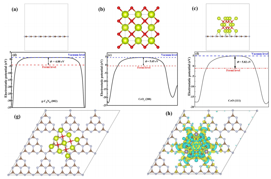 圖8。g-C3N4(a)和CeO2(b)的頂視圖和側視圖。g-C3N4(c)和CeO2(d)的逸出功。CeO2/g-C3N4的電荷密度差(e,頂視圖和側視圖)(黃色等值面:電子積累,藍色等值面:電子耗盡,等值面值為0.002 e Å^-3)。