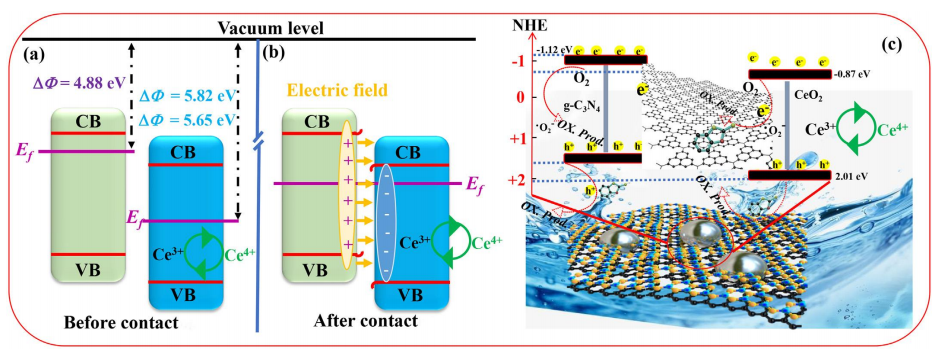 圖9。CeO2和g-C3N4在接觸前(a)和接觸后(b)的電荷轉移示意圖,以及可見光照射下CeO2@N-GO/g-C3N4的光催化機制(c)的提出。