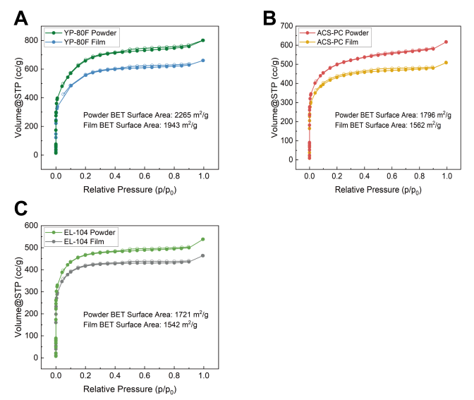 (A)YP-80F粉末與薄膜的等溫線;(B)ACS-PC粉末與薄膜的等溫線;(C)EL-104粉末與薄膜的等溫線。