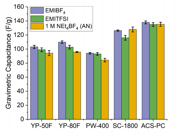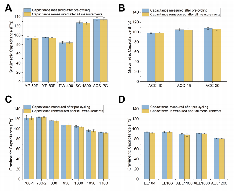實(shí)驗(yàn)表明:在每種電解液中,ACS-PC和SC-1800的電容性能最優(yōu),而PW-400表現(xiàn)最差。這一結(jié)果驗(yàn)證了碳材料的電容性能差異是普適性趨勢(shì)(如比表面積、孔徑分布主導(dǎo)),而非僅由特定電解液的適配性決定。