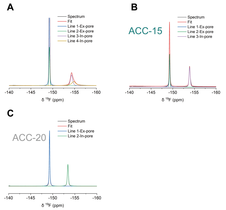 圖S11:浸泡于1 M NEt4BF4(乙腈溶液)的(A)ACC-10、(B)ACC-15及(C)ACC-20的¹?F NMR譜去卷積分析