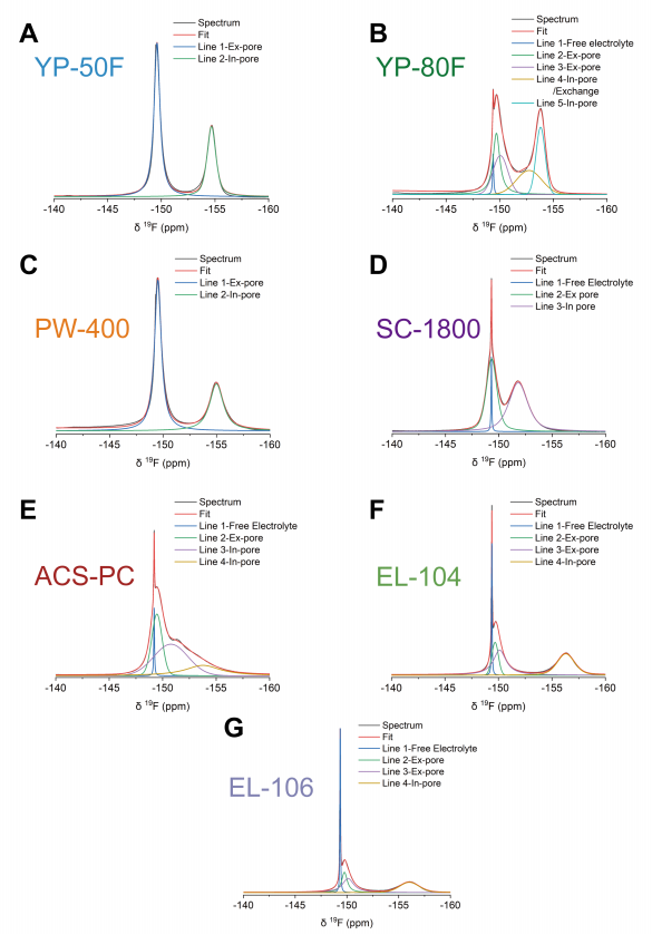 (A)YP-50F、(B)YP-80F、(C)PW-400、(D)SC-1800、(E)ACS-PC、(F)EL-104及(G)EL-106在1 M NEt4BF4(乙腈溶液)中的¹?F NMR譜去卷積結(jié)果。