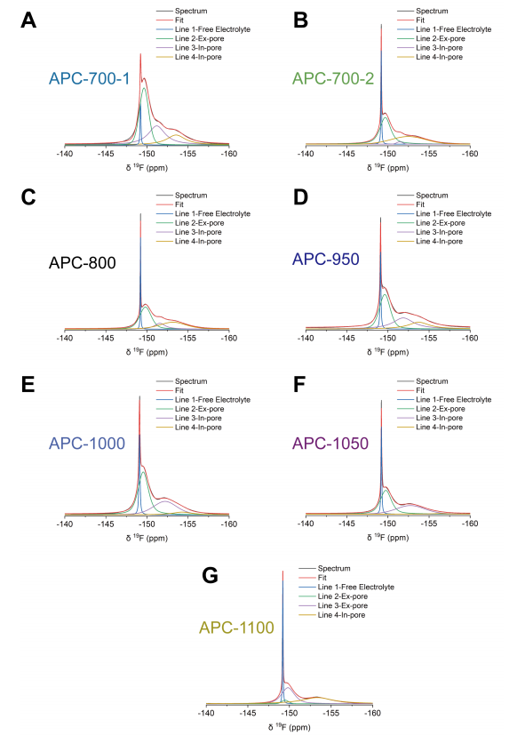 (A)APC-700-1、(B)APC-700-2、(C)APC-800、(D)APC-950、(E)APC-1000、(F)APC-1050及(G)APC-1100樣品的¹?F NMR譜去卷積結(jié)果顯示:需采用‌雙孔內(nèi)峰‌擬合孔內(nèi)特征峰,表明APC系列材料具有‌非均質(zhì)孔道網(wǎng)絡(luò)‌,其孔道內(nèi)存在不同結(jié)構(gòu)的區(qū)域‌13。