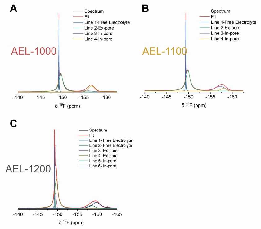 (A)AEL-1000、(B)AEL-1100及(C)AEL-1200樣品的¹?F NMR譜去卷積結(jié)果顯示:‌同樣需采用雙孔內(nèi)峰‌擬合孔內(nèi)特征峰,表明AEL系列材料具有‌非均質(zhì)孔道網(wǎng)絡(luò)‌,其孔道內(nèi)存在不同結(jié)構(gòu)的區(qū)域。