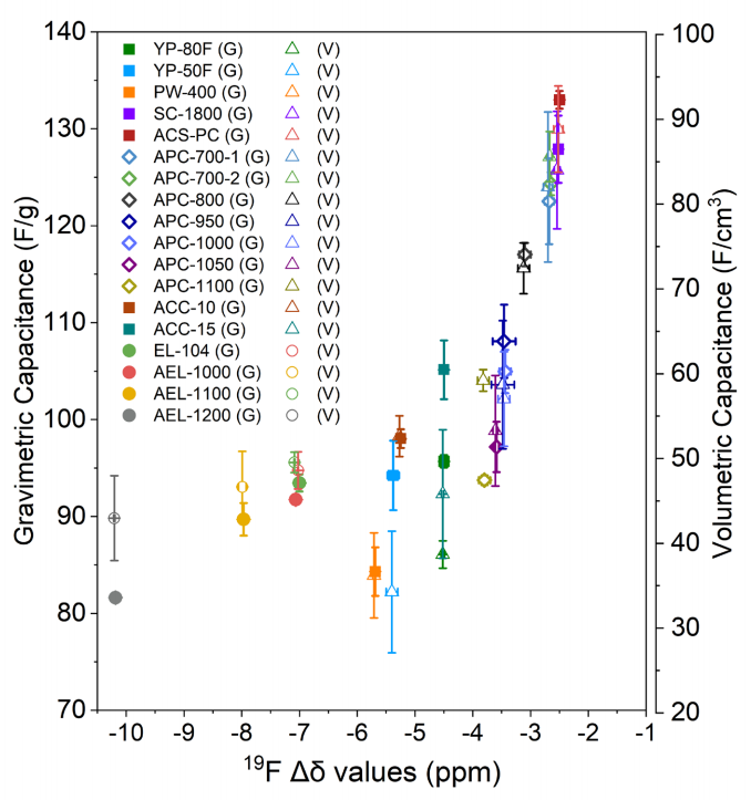 圖 S17:五種選定碳材料的¹?F NMR譜圖及其在離子液體中重量比電容與¹?F Δδ值的關(guān)聯(lián)關(guān)系