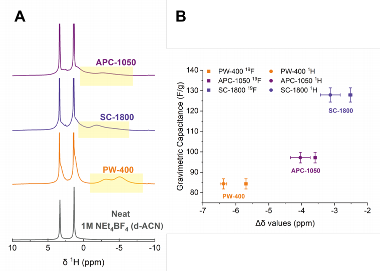 (B) EMIBF4離子液體中五種商用活性炭的重量比電容與¹?F Δδ值的關(guān)聯(lián)關(guān)系。