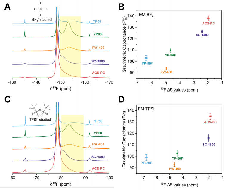 (D) EMITFSI離子液體中五種商用活性炭的重量比電容與¹?F Δδ值的關(guān)聯(lián)關(guān)系。