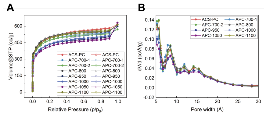 (B) 基于77 K下N?等溫線的淬火固體密度泛函理論分析(狹縫孔模型)計算的原始ACS-PC及熱退火處理ACS-PC材料的孔徑分布圖34。實驗結(jié)果表明,氬氣氛圍熱退火處理后,材料的等溫線與孔徑分布僅發(fā)生微小變化。