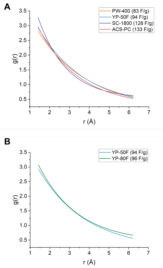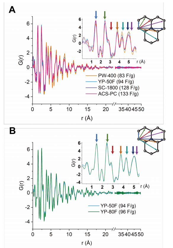 (A) 四種具有相似孔徑分布的商用活性炭(PW-400、YP-50F、SC-1800和ACS-PC,電容值已標(biāo)注)的X射線PDF圖譜對比。