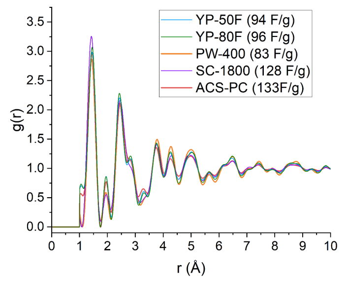 圖 S20:五種商用活性炭(YP-50F、YP-80F、PW-400、SC-1800和ACS-PC,電容值已標(biāo)注)的重新歸一化對分布函數(shù)(PDF)g(r)對比。