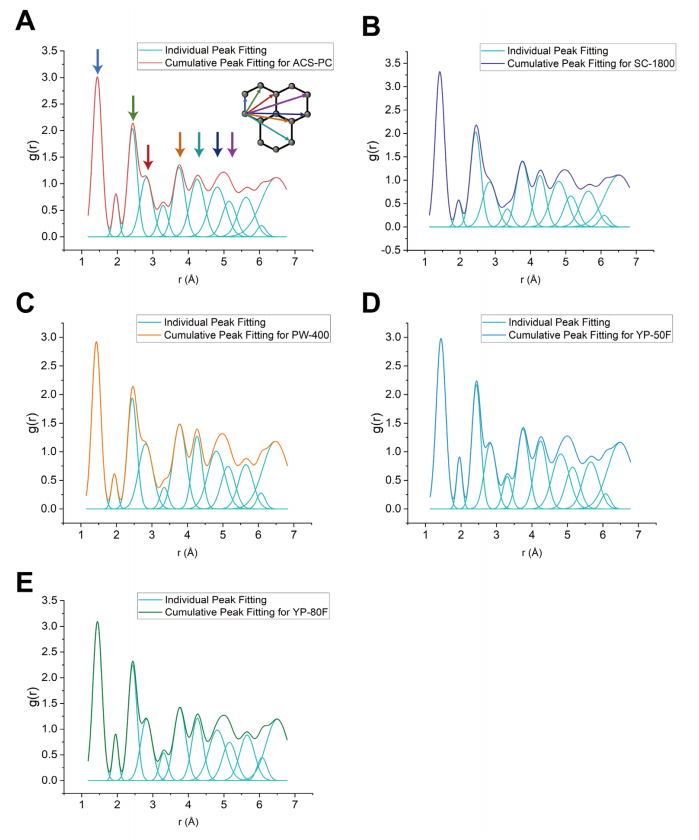 (A)-(E) 分別展示了五種碳材料((A) ACS-PC(紅色)、(B) SC-1800(紫色)、(C) PW-400(橙色)、(D) YP-50F(藍(lán)色)、(E) YP-80F(綠色))的X射線PDF高斯擬合結(jié)果。
