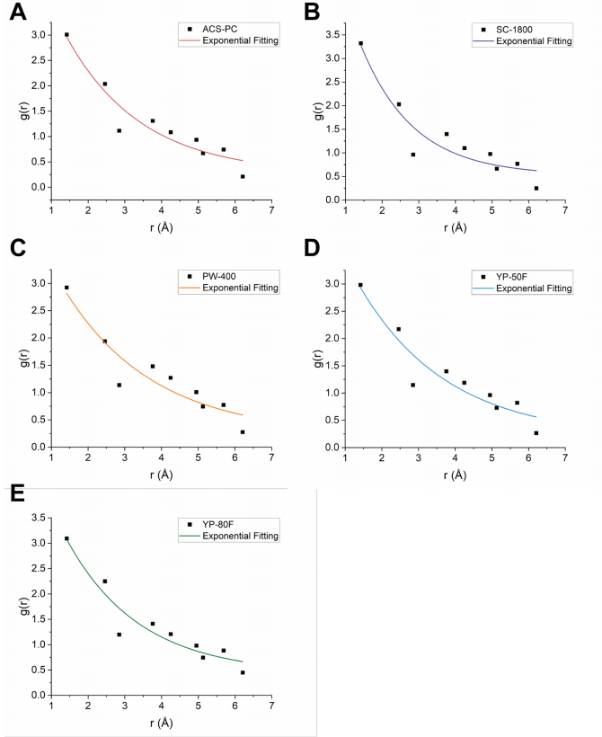 (A)-(E) 分別展示了五種碳材料((A) ACS-PC(紅色曲線)、(B) SC-1800(紫色曲線)、(C) PW-400(橙色曲線)、(D) YP-50F(藍(lán)色曲線)、(E) YP-80F(綠色曲線))的指數(shù)擬合結(jié)果:
