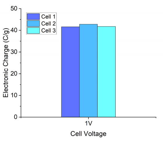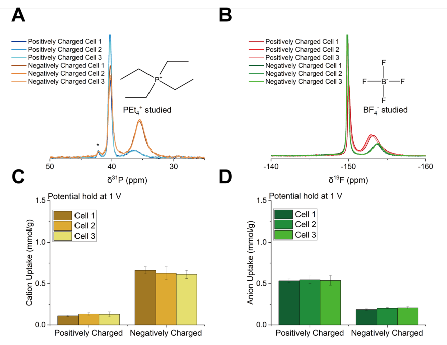 (C) 1 V充電后拆解的三組相同超級電容器正極與負(fù)極的陽離子吸附量;