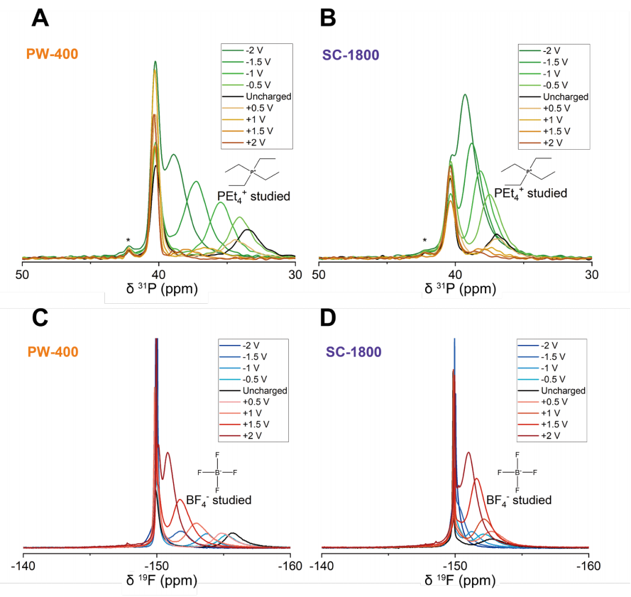 (D) SC-1800型超級電容器正極與負(fù)極在不同充電電壓(0.5 V至2 V)下的¹?F NMR譜圖。