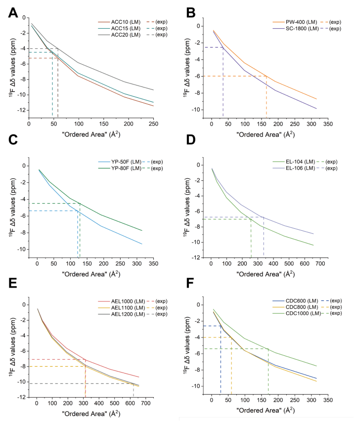 (A) 浸泡于EMIBF4離子液體的五種商用活性炭的¹?F NMR譜圖。