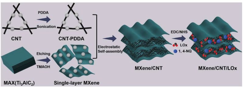 將經PDDA修飾的單壁碳納米管(CNT-PDDA)與單層MXene納米片通過靜電作用結合,形成三維層級結構MXene/CNT;隨后將乳酸氧化酶(LOx)和1,4-萘醌(1,4-NQ)進一步引入并嵌入MXene/CNT層間,最終得到MXene/CNT/LOx生物陽極。