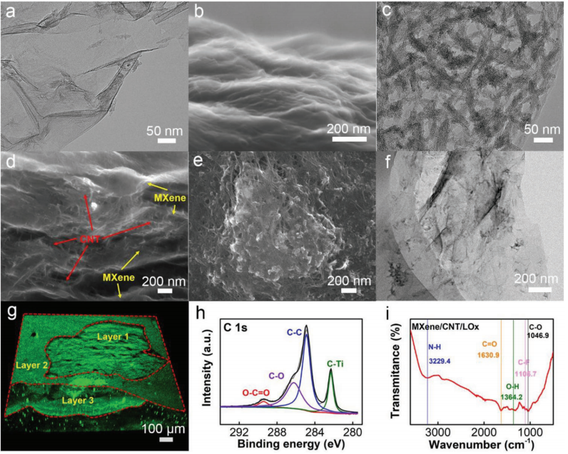 a) MXene電極的透射電子顯微鏡(TEM)圖像;b) MXene電極的截面掃描電子顯微鏡(SEM)圖像;c) MXene/CNT電極的TEM圖像;d) MXene/CNT電極的截面SEM圖像;e) MXene/CNT/LOx生物陽極的高倍SEM圖像;f) MXene/CNT/LOx生物陽極的TEM圖像;g) MXene/CNT/LOx吸附異硫氰酸熒光素(FITC,綠色)后的三維共聚焦激光掃描顯微鏡(CLSM)圖像,虛線圓圈標出不同層結構;h) 經EDC/NHS修飾的MXene/CNT電極的C 1s高分辨X射線光電子能譜(XPS);i) MXene/CNT/LOx生物陽極的傅里葉變換紅外光譜(FTIR)。