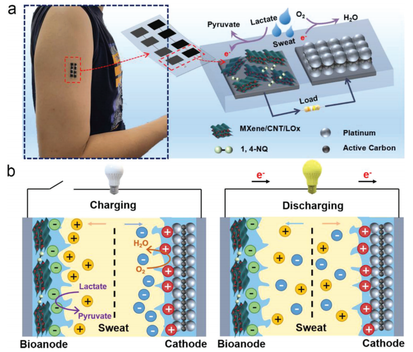 a) 可貼附皮膚的BSC裝置示意圖。單個BFC單元通過汗液中的乳酸生成能量,并以電容形式存儲;四個單元通過液態金屬導體連接。