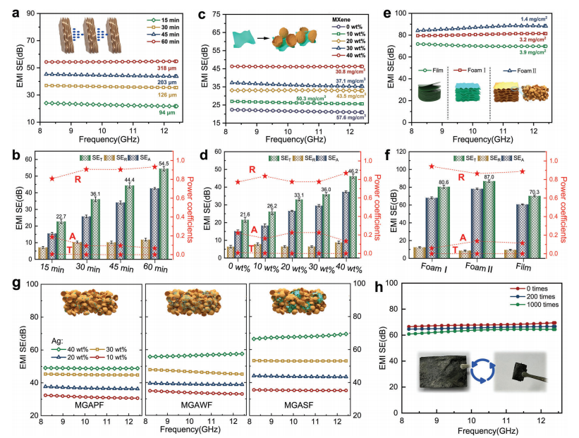 圖3. 電磁屏蔽性能表征(詳見支撐材料圖S14–S24)