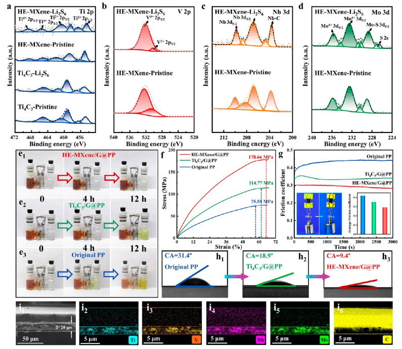 (i1) 截面SEM圖像顯示HE-MXene/G@PP隔膜厚度為3μm,(i2−i6) EDS面掃證實Ti、V、Nb、Mo、C元素在石墨烯基底上的均勻分布,無元素偏析現(xiàn)象。