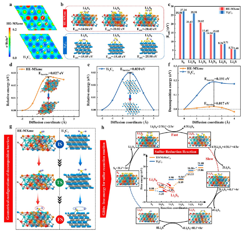 (f, g) Li?S分解構(gòu)型與能量曲線:HE-MXene表面Li?S分解能壘(0.54eV)較Ti?C?(0.92eV)降低41%,插圖為分解過程的初始態(tài)(IS)、過渡態(tài)(TS)和終態(tài)(FS)構(gòu)型17。