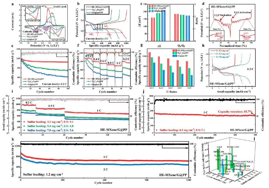 (j) HE-MXene/G@PP結(jié)構(gòu)示意圖,闡明其通過多孔石墨烯骨架物理阻隔多硫化物,同時高熵MXene表面活性位點促進電子轉(zhuǎn)移與硫物種氧化還原反應(yīng)。