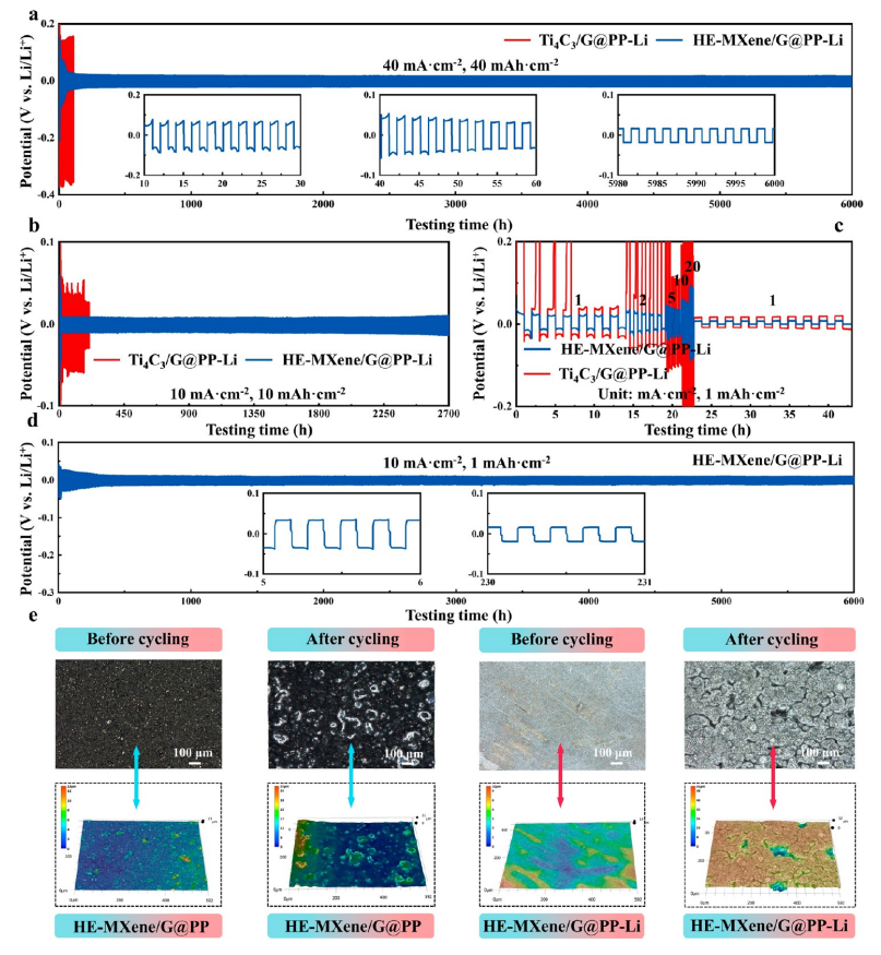 鋰沉積均勻化:HE-MXene的晶格畸變形成梯度離子通道,引導(dǎo)鋰離子均勻成核,抑制枝晶生長(SEM顯示無枝晶形貌)。