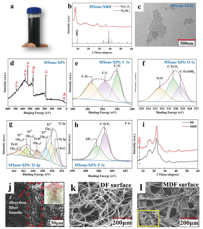a) 光學照片,b) XRD圖譜,c) TEM圖像,d)-h) 制備MXene的XPS譜圖;i) 3D針刺廢舊牛仔布氈及MXene/3D針刺廢舊牛仔布氈的XRD圖譜,j)-l) SEM圖像