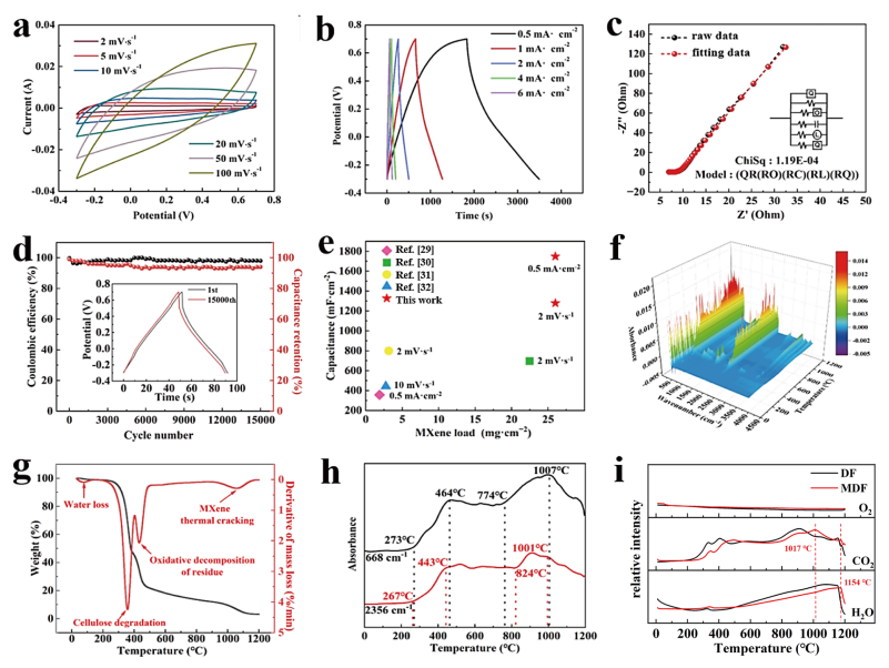 a) 不同掃描速率下的CV曲線,b) 不同電流密度下的GCD曲線,c) 電化學阻抗譜(EIS),d) CMDF在6 mA·cm?²電流密度下的循環穩定性測試,e) CMDF的MXene負載量與電容性能對比(與其他文獻報道的MXene基紡織品比較),f) MDF在0~1200°C加熱過程中的熱重-紅外-質譜聯用(TG-IR-MS)三維分析結果,g) 熱重(TG)曲線,h) 加熱至1200°C過程中MDF的傅里葉變換紅外光譜(FTIR),i) DF與MDF在0~1200°C溫度范圍內的分解氣體分析