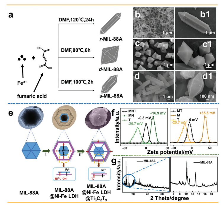 e) MN(MIL-88A@Ni-Fe LDH)和MNT(MIL-88A@Ni-Fe LDH@Ti?C?T?)復(fù)合材料合成過程及反應(yīng)機(jī)制示意圖;
