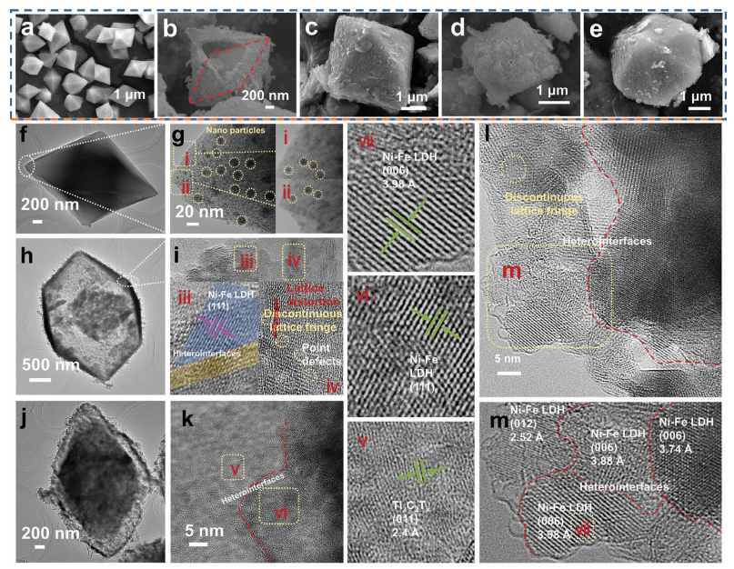 j)–m) MIL-88A@Ni-Fe LDH@Ti?C?T?-1.0的TEM、HR-TEM圖像及晶格缺陷分析。