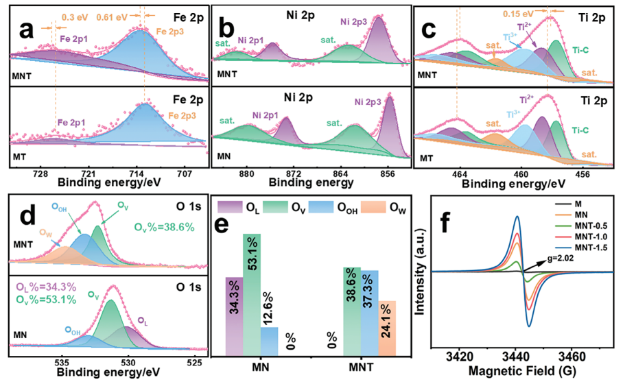 MNT中氧空位(O空位峰)占比(~35.7%)顯著高于MN(~22.3%),表明MXene引入促進(jìn)缺陷生成。