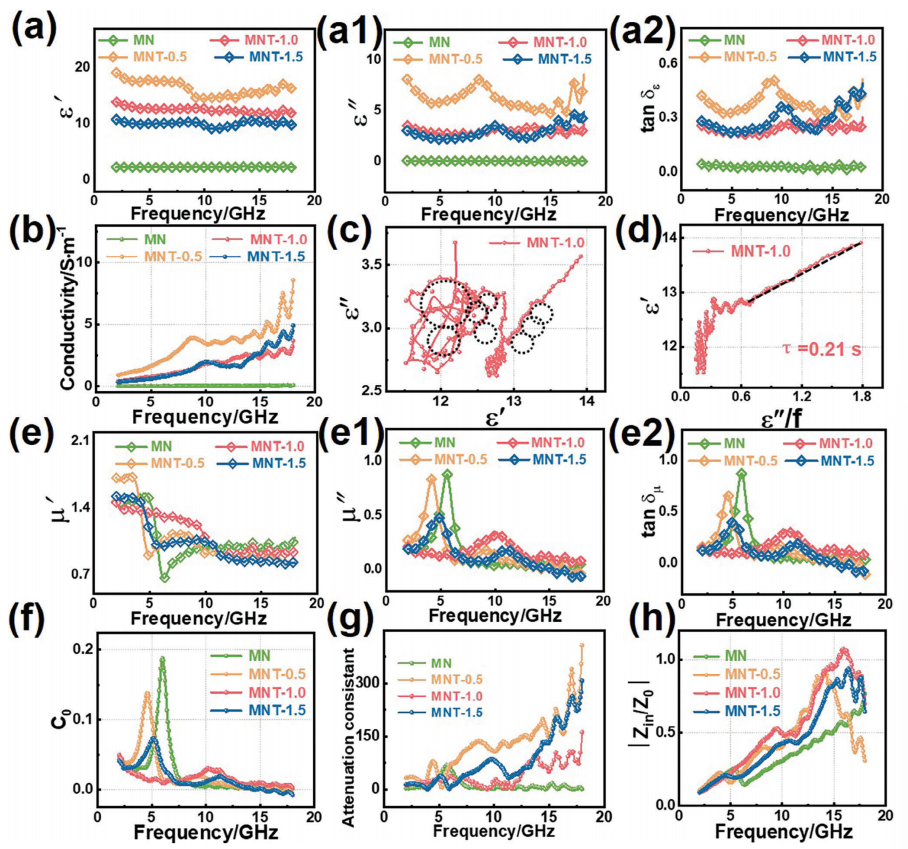 ‌MNT-1.0‌的Cole-Cole曲線(c)呈現(xiàn)多弧特征,表明界面極化主導(dǎo)損耗;