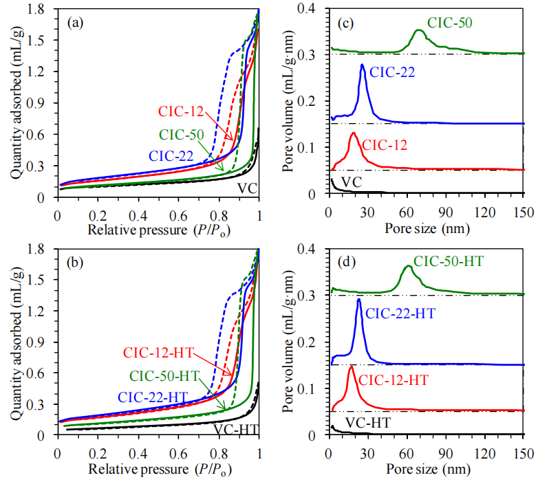 (a)吸附支、(b)脫附支數(shù)據(jù)通過Barrett-Joyner-Halenda (BJH) 方法計(jì)算,并以炭黑t-曲線為標(biāo)準(zhǔn)確定氮?dú)馕侥さ慕y(tǒng)計(jì)厚度。