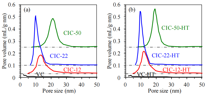 圖4.5. 熱處理前后碳材料的孔徑分布對比。(a) 未熱處理、(b) 在氮?dú)鈿夥罩杏?500°C下熱處理2小時(shí)(HT)后的碳材料孔徑分布。基于氮?dú)馕摳降葴鼐€(圖3)的脫附支數(shù)據(jù),采用Barrett-Joyner-Halenda(BJH)方法計(jì)算,并以碳黑t曲線為標(biāo)準(zhǔn)確定吸附氮膜的統(tǒng)計(jì)厚度[172]。分布曲線下方的點(diǎn)劃虛線(dash-dot-dot lines)表示對應(yīng)圖的基線。
