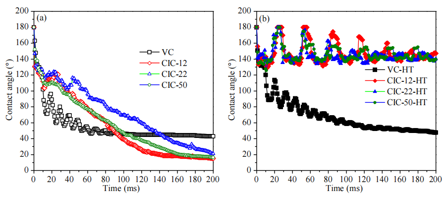熱處理前后接觸角動態(tài)變化(如接觸角滯后)可關(guān)聯(lián)OMCs表面官能團(tuán)演化與介孔連通性差異;