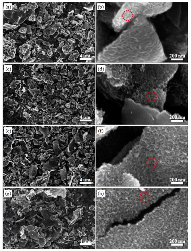 圖4.2. 火山碳(VC)及其熱處理衍生物與不同比例碳離子液體復(fù)合材料的場發(fā)射掃描電子顯微鏡(FE-SEM)高倍圖像。(a) VC、(b) VC-HT(熱處理)、(c) CIC-12、(d) CIC-12-HT、(e) CIC-22、(f) CIC-22-HT、(g) CIC-50、(h) CIC-50-HT。所有粉末樣品均以碳導(dǎo)電膠帶為基底,于高倍率下觀測。