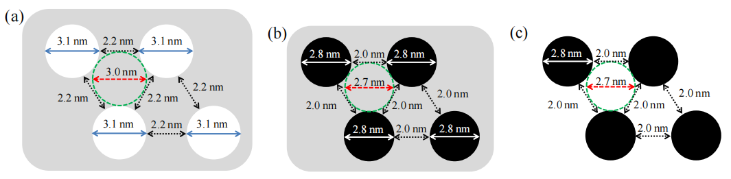 圖5.5. (a) 六方介孔二氧化硅(HMS, 灰色)模板的孔隙(白色圓)與孔壁截面尺寸示意圖(該模板用于合成有序介孔碳OMCs)[49, 132];(b) 碳前驅(qū)體填充的HMS模板(a)經(jīng)高溫(900°C)熱處理后,孔隙內(nèi)填充碳納米鏈(黑色圓)的截面尺寸示意圖;(c) 移除二氧化硅模板后(b),OMCs孔隙的截面尺寸示意圖。綠色虛線圓(a-c)與其外圍三個(gè)圓相切,分別表征HMS模板的二氧化硅壁厚度(a-b)或相鄰碳納米鏈之間的孔隙尺寸(c);箭頭(a-c)表示圓的直徑或兩圓邊緣之間的間隙距離。
