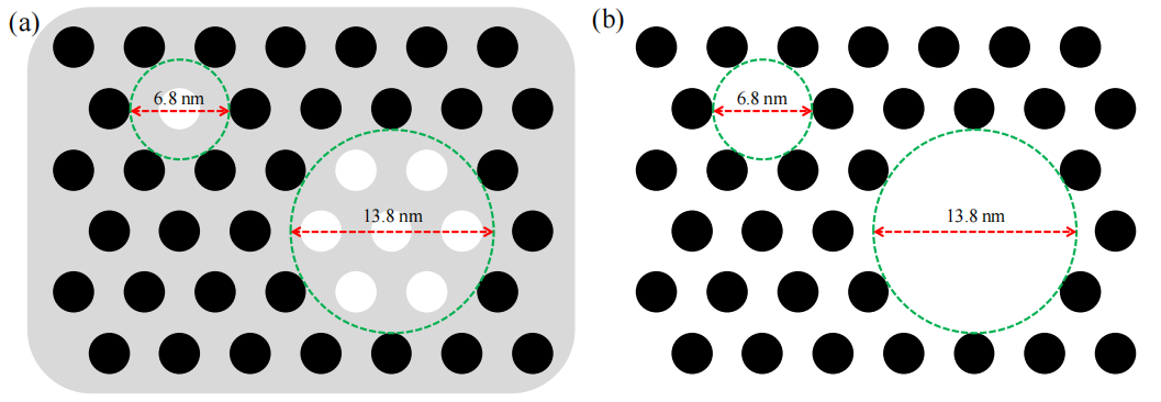 圖5.6. (a) 碳/HMS復(fù)合材料經(jīng)900°C加熱但尚未去除二氧化硅時(shí)的截面尺寸示意圖(黑色圓:碳納米鏈;白色圓:未填充孔隙,其尺寸與圖4b一致),(b) 移除二氧化硅后由碳納米鏈包圍的圓柱形孔道示意圖(虛線圓表征碳鏈外圍形成的孔隙)。