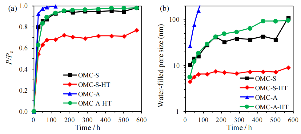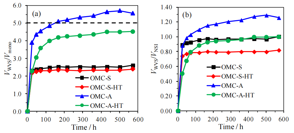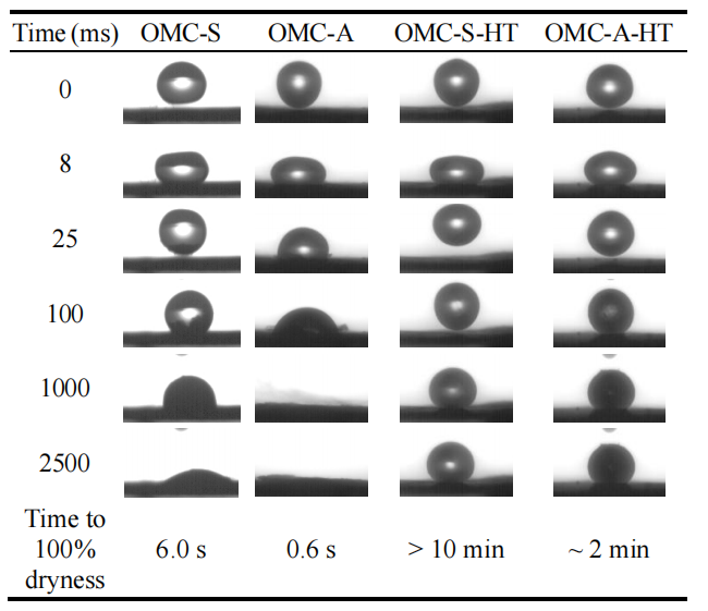 “完全干燥時(shí)間”反映毛細(xì)作用力與孔道潤濕性的競爭關(guān)系,量化OMCs表面能及孔隙輸運(yùn)效率;