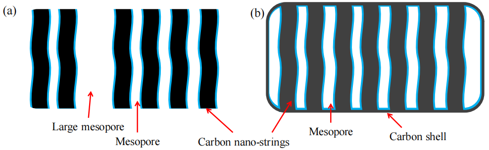 對比(a)(b)可直觀呈現(xiàn)“碳填充-模板刻蝕”的孔道反轉(zhuǎn)機(jī)制,為調(diào)控OMCs孔結(jié)構(gòu)提供可視化依據(jù)。