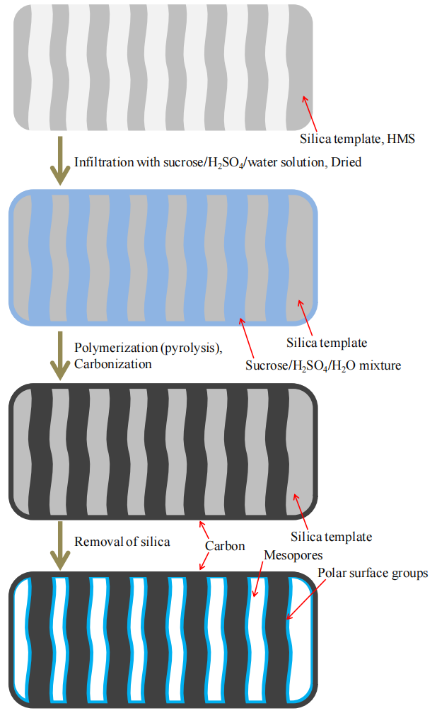 圖5.1. 以有序介孔二氧化硅為模板制備有序介孔碳(OMC)的示意圖[71]。