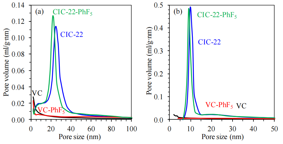 微孔減少:-PhF5基團(tuán)接枝可能覆蓋部分微孔表面(如功能化后<2 nm孔隙占比下降),導(dǎo)致有效孔徑分布向介孔偏移;