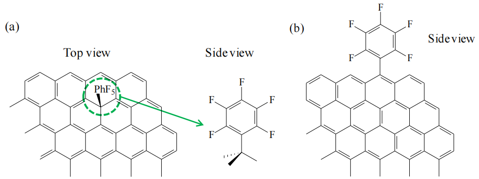 平面石墨烯(圖a):C-C單鍵可能通過芳環(huán)平面上的sp²碳與-PhF5基團(tuán)形成定向共價(jià)連接,受表面π電子云分布影響;