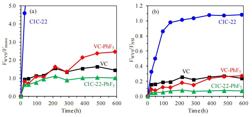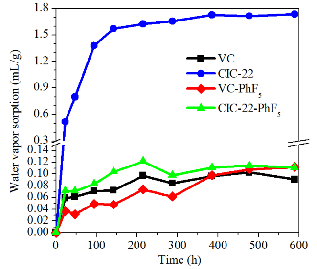圖6.5. 五氟苯基(-PhF5)基團(tuán)表面功能化前后VC與CIC-22材料在室溫水蒸氣環(huán)境中的水蒸氣吸附(WVS)數(shù)據(jù)